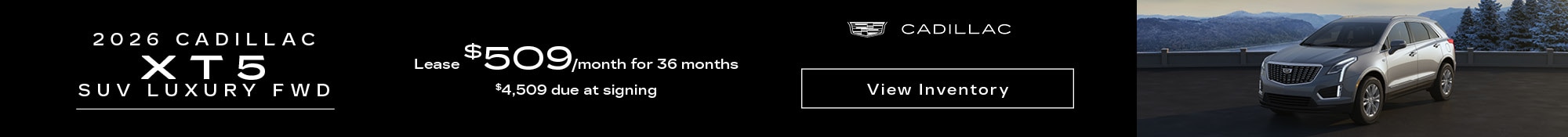 Black 2026 Cadillac XT5 Premium Luxury AWD 9-Speed Automatic 2.0L Turbocharged 14 Speakers, 170 Amp Alternator, 2-Way Power Driver Lumbar Control Seat Adjuster, 2-Way Power Passenger Lumbar Control Seat Adjuster, 3.47 Axle Ratio, 4-Wheel Disc Brakes, 4-Wheel Independent Suspension, ABS brakes, Air Conditioning, Alloy wheels, AM/FM radio: SiriusXM, Audio memory, Auto High-beam Headlights, Auto-dimming door mirrors, Auto-dimming Rear-View mirror, Automatic Stop/Start w/Disable, Automatic temperature control, Bodyside moldings, Bose Performance Series 14-Speaker System, Brake assist, Bumpers: body-color, Compass, Delay-off headlights, Driver door bin, Driver vanity mirror, Dual front impact airbags, Dual front side impact airbags, Electronic Stability Control, Emergency communication system: OnStar and Cadillac connected services capable, Four wheel independent suspension, Front anti-roll bar, Front Bucket Seats, Front Center Armrest, Front dual zone A/C, Front reading lights, Fully automatic headlights, Garage door transmitter, Genuine wood dashboard insert, Genuine wood door panel insert, Heads-Up Display, Heated door mirrors, Heated Driver & Front Passenger Seats, Heated front seats, Heated steering wheel, Illuminated entry, Knee airbag, Leather Seating Surfaces w/Mini Perforated Inserts, Low tire pressure warning, Memory seat, Navigation System, Occupant sensing airbag, Outside temperature display, Overhead airbag, Overhead console, Panic alarm, Passenger door bin, Passenger vanity mirror, Power door mirrors, Power driver seat, Power Liftgate, Power moonroof: UltraView, Power passenger seat, Power steering, Power windows, Radio data system, Radio: Cadillac User Experience w/Embedded Nav, Rain sensing wipers, Rear anti-roll bar, Rear reading lights, Rear seat center armrest, Rear window defroster, Rear window wiper, Remote keyless entry, Security system, SiriusXM w/360L Trial Subscription, Speed control, Speed-sensing steering, Split folding rear seat, Spoiler, Steering wheel memory, Steering wheel mounted audio controls, Tachometer, Telescoping steering wheel, Tilt steering wheel, Traction control, Trip computer, Turn signal indicator mirrors, Variably intermittent wipers, Voltmeter, Wheels: 20 6-Split Spoke Alloy, Wireless Apple CarPlay/Wireless Android Auto, Wireless Phone Charging.