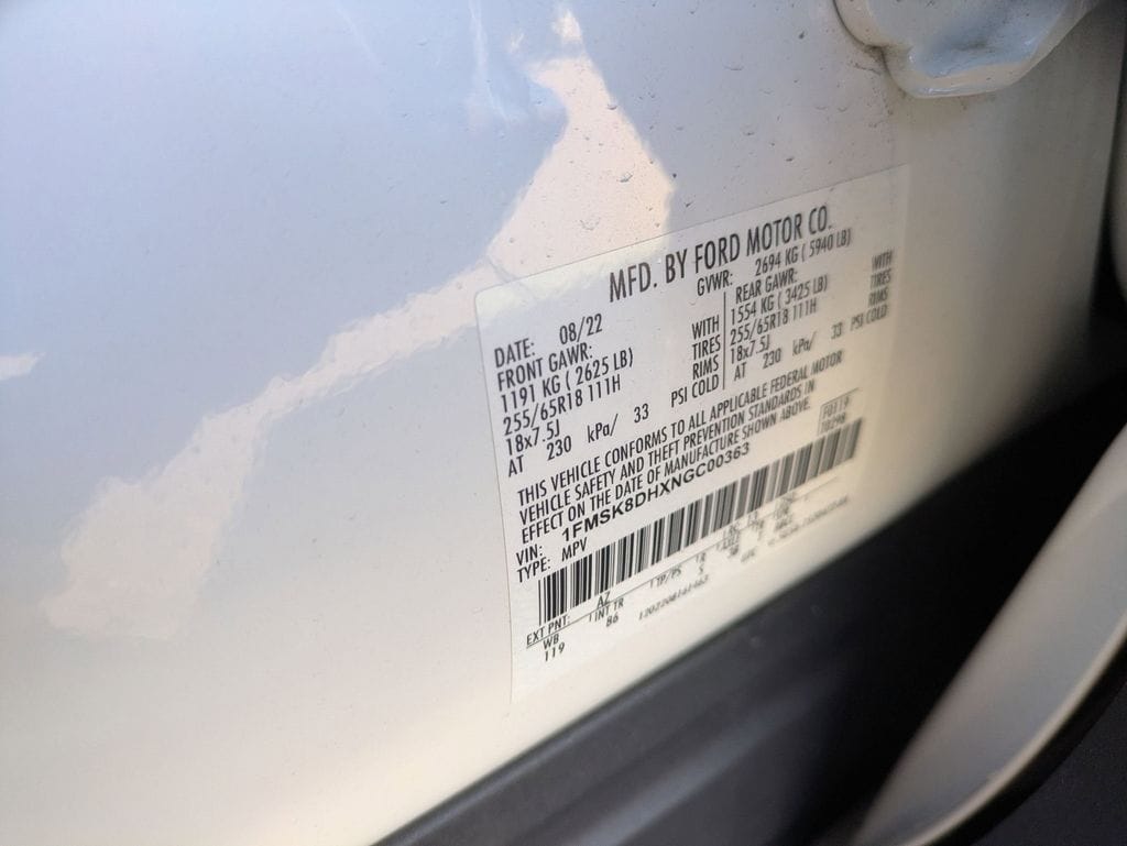 4WD, 1st Row Heated Seats, 3.58 Non-Limited-Slip Rear Axle Ratio, 3rd row seats: bench, 4-Wheel Disc Brakes, 6 Speakers, ABS brakes, Air Conditioning, Alloy wheels, AM/FM radio: SiriusXM, AM/FM Stereo, Auto High-beam Headlights, Auto Start-Stop Removal, Automatic temperature control, Brake assist, Bumpers: body-color, Class IV Trailer Tow Package, Compass, Delay-off headlights, Driver door bin, Driver vanity mirror, Dual front impact airbags, Dual front side impact airbags, Electronic Stability Control, Emergency communication system: SYNC 3 911 Assist, Equipment Group 200A, Exterior Parking Camera Rear, FordPass Connect, Four wheel independent suspension, Front anti-roll bar, Front Bucket Seats, Front Center Armrest, Front dual zone A/C, Front License Plate Bracket, Front reading lights, Fully automatic headlights, Heated door mirrors, Heated front seats, Illuminated entry, Knee airbag, Leather steering wheel, Low tire pressure warning, Occupant sensing airbag, Outside temperature display, Overhead airbag, Overhead console, Panic alarm, Passenger door bin, Passenger vanity mirror, Power door mirrors, Power driver seat, Power Liftgate, Power passenger seat, Power steering, Power windows, Rear air conditioning, Rear anti-roll bar, Rear Auxiliary Controls Credit, Rear reading lights, Rear window defroster, Rear window wiper, Remote keyless entry, Roof rack: rails only, Security system, Speed control, Speed-sensing steering, Speed-Sensitive Wipers, Split folding rear seat, Spoiler, Steering wheel mounted audio controls, SYNC 3 Communications & Entertainment System, SYNC 3/Apple CarPlay/Android Auto, Tachometer, Telescoping steering wheel, Tilt steering wheel, Traction control, Trip computer, Unique Cloth Captain's Chairs, Variably intermittent wipers, Wheels: 18" 5-Spoke Silver-Painted Aluminum, 4WD.